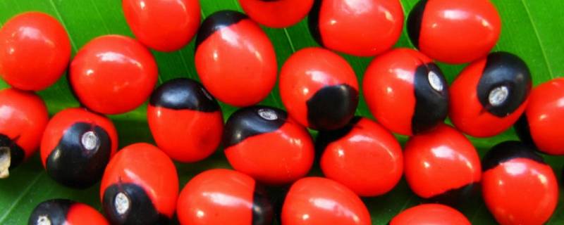 种子里面一红一紫是相思子,相思子一端为红色,另一端为黑色。相思子别称红豆,藤本,茎细弱,多分枝。种子椭圆形,平滑具光泽,上部约三分之二为鲜红色,下部三分之一为黑色。花期3-6月,果期9-10月。相思子是豆科相思子属的一种有毒植物,广泛分布于热带地区。种子中含有一种称为相思豆毒蛋白的蛋白质,此毒素具有很强的毒性,误食时会中毒。种子可以做成珠串饰物与打击乐器;有些民间地区亦流传有以茎入茶增添香气的做法。