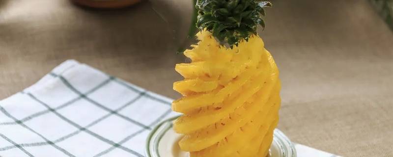 1、把菠萝放在案板上,用刀把菠萝的底部切下来,用刀把菠萝的皮给切下来,只留下菠萝的果肉。戴上一次性手套,一只手拿着菠萝头上的叶子,用刀切成差不多大小的4份菠萝,然后再把菠萝切成小块即可。