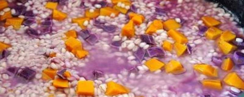 5、大约煮10分钟左右,青稞米基本熟了加入紫薯和南瓜,继续煮10分钟即可。