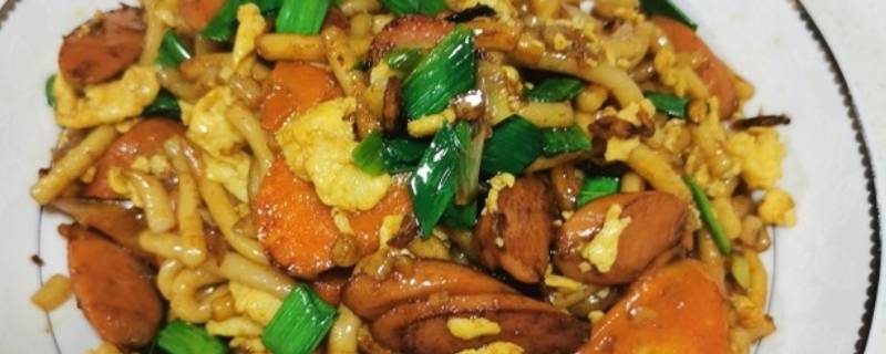 4、放入胡萝卜、火腿肠翻炒。