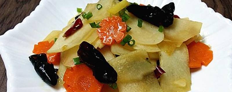 用料:地瓜440克、木耳50克、胡萝卜180克、芥花油适量、香葱1根、姜丝少许、料酒少许、生抽少许、食盐1小勺、味精少许、干辣椒3个。