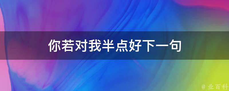 你若对我半点好下一句是我会还你一辈子的好。这句话可以表示一种深情的情感,也可以表示一种互惠互利的态度。它意味着如果你对我表现出一点点的善意或好意,我会非常感激,并且愿意回报你更多的好意和帮助。这种表达方式可以用于朋友、家人、恋人或任何其他人际关系中,表示对对方的感激和回报。