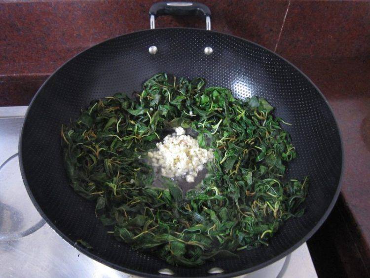 8、炒两分钟后把麻叶推到四周,加入油,蒜末。