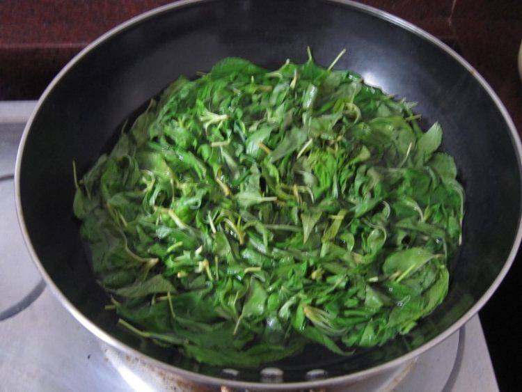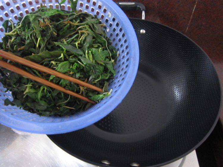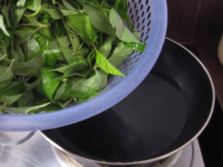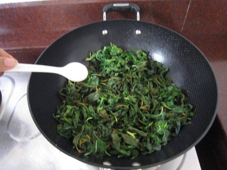7、置锅火上倒入麻叶(让其蒸发多余水分)。