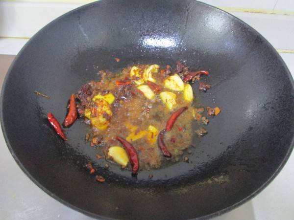 5、热锅倒入油,温油先把花椒爆香,等油热后把郫县豆瓣酱炒出香味后把姜片,蒜片和干辣椒倒入炒匀。