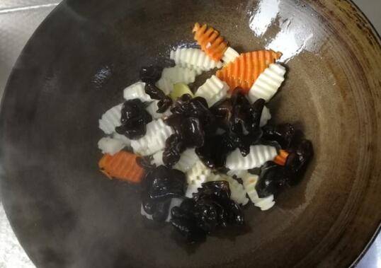 7、翻炒一分钟后,倒入黑木耳继续翻炒。