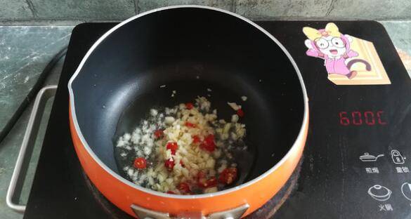 6、烧热油锅后,放入食用油,蒜米和辣椒煸出香味。
