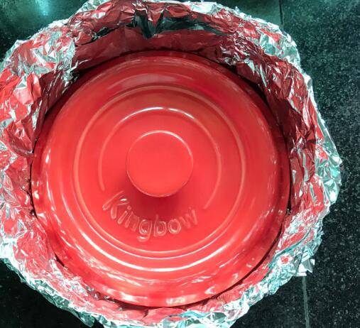 准备2张45-50厘米的锡纸交叉叠放,沿锅盖边缘叠成碗状。