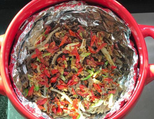 将炒好的泡椒汁均匀的淋在牛百叶上,大火5分钟后转中火3分钟即可出锅。