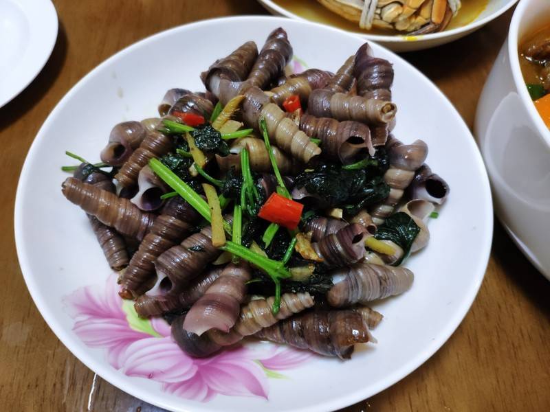 用料:锥螺500克、紫苏叶20片、姜适量、酱油1克、盐适量、红辣椒1个、植物油适量、蒜1瓣。