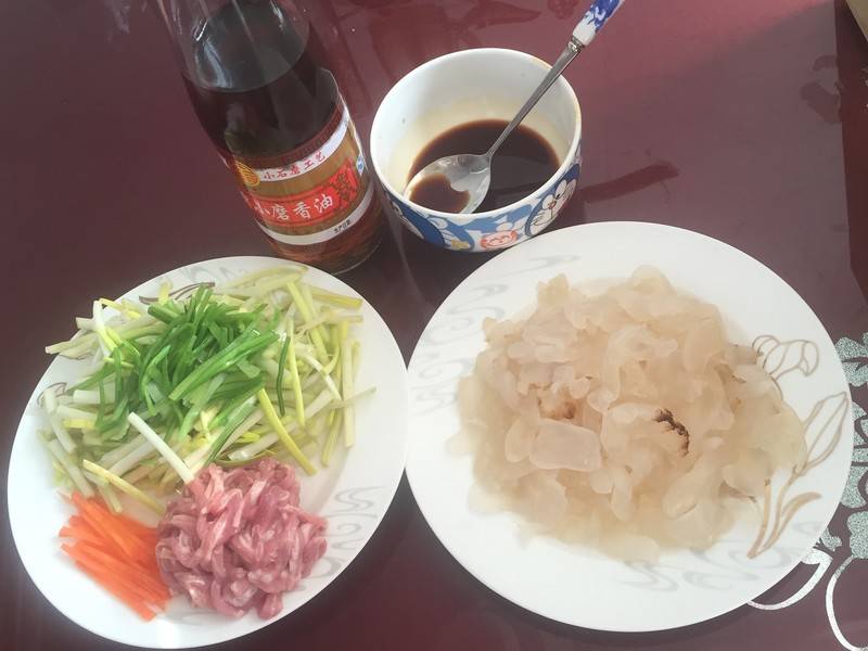 用料:猪肉、胡萝卜、蒜黄、香菜、海蜇、生抽、料酒、淀粉、香油、花生油。