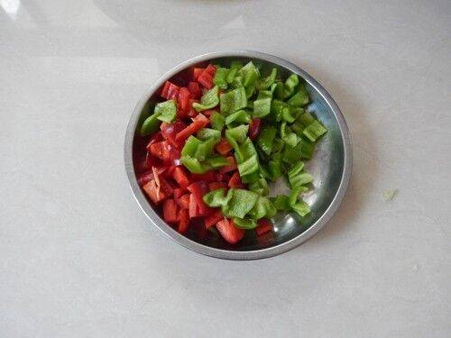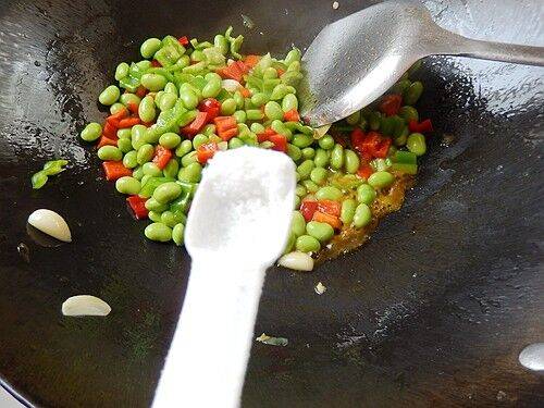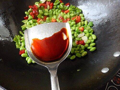 1、食材准备:毛豆150克、大蒜、精盐、生抽、菜籽油、青椒、红椒各适量。
