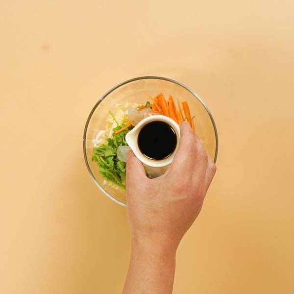 4、加入醋、生抽、白砂糖、盐、香油、蒜末。