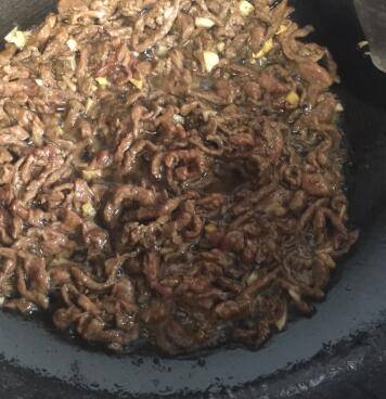 锅中倒入油烧热,放入大蒜头和生姜爆香,倒入牛肉丝翻炒变色。