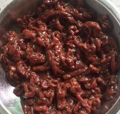 豆芽两头摘掉,牛肉逆向纹路切丝。