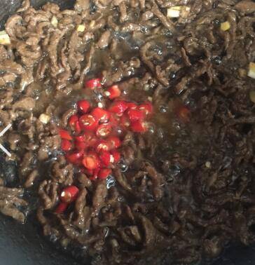牛肉丝炒至变色放入小米辣翻炒2分钟,倒入少许盐和黄酒炒香。