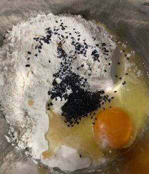 鸡蛋,芝麻,面粉,适量水,搅拌。