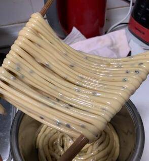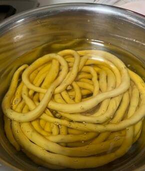隔天将细长条面团继续拉长、拉细。
