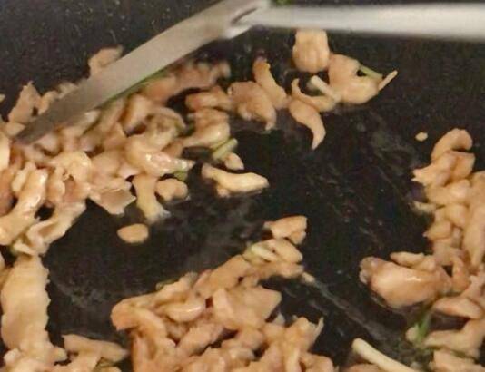 6、锅热倒油,油烧至温热,将调好味的鸡肉下锅快速翻炒,刚刚变色就要立刻盛出。