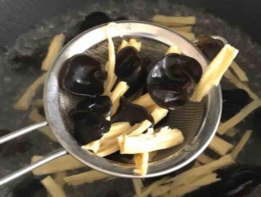 5、水烧开加点盐,然后将泡开的腐竹和木耳放入锅里煮开两分钟后捞出。
