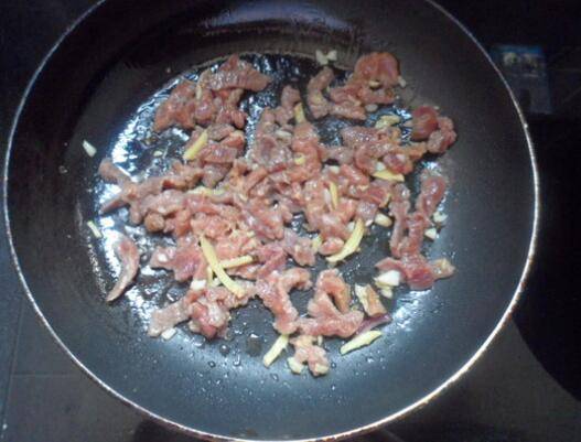 4、放入牛肉丝煸炒9分熟。