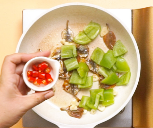 5、倒入青椒,倒入小米椒,翻炒均匀。