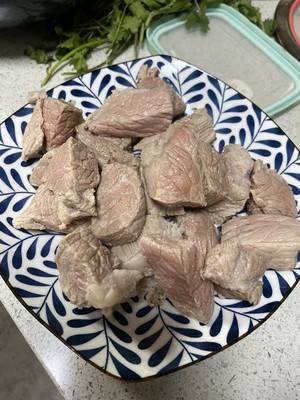 1、准备材料:葱花碎适量、青菜3颗、冰糖适量、牛肉适量、面条1份、酱油三勺、老抽半勺、八角一个、香叶两片。