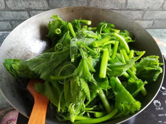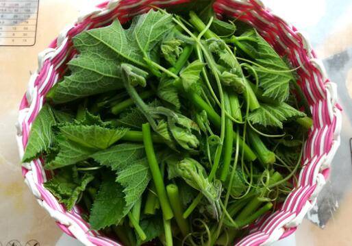 1、南瓜苗叶子沿着顶端,把表面的绒毛慢慢的撕掉,掐成合适入口的长度。