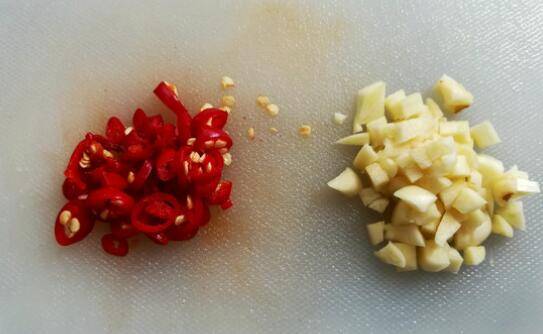 4、烧热油锅,放入蒜米和辣椒爆香。