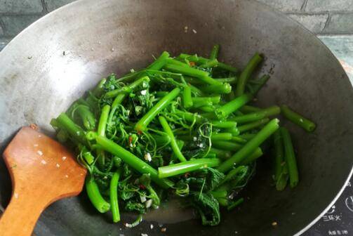 6、南瓜苗翻炒到颜色变深,体积缩小时加盐和蚝油调味。