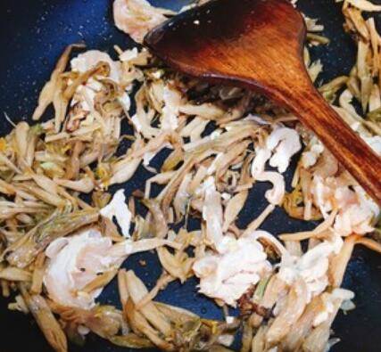 5.倒入鸡丝翻炒断生,盛出备用。