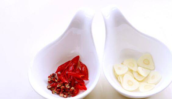 7、热锅热油,下入花椒粒、蒜片和辣椒段炒出香辣味。