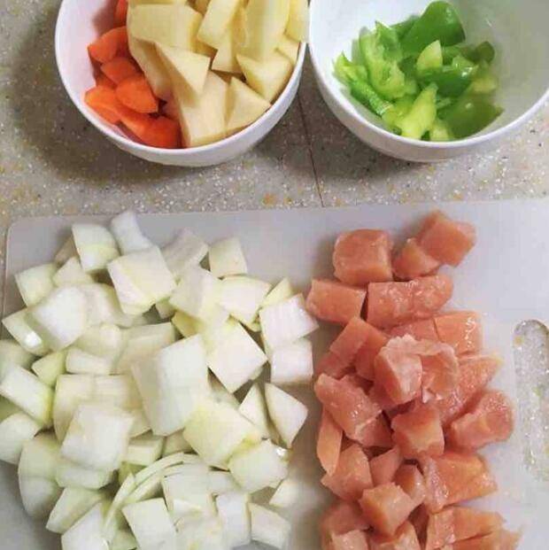 2、鸡胸肉清洗干净,放冰箱冷冻半小时变硬些,切成2cm见方的小块;洋葱、土豆、胡萝卜和青椒分别洗净切2cm左右的小块。