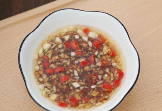 3、蒜和小米椒切碎装入碗中,加入适量热油,然后加入1勺生抽、1勺蚝油、半勺白糖和适量盐,将其搅拌均匀。