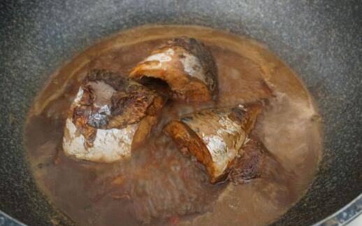 5、将切段后的青占鱼放进炒糖的锅里,翻炒几下。