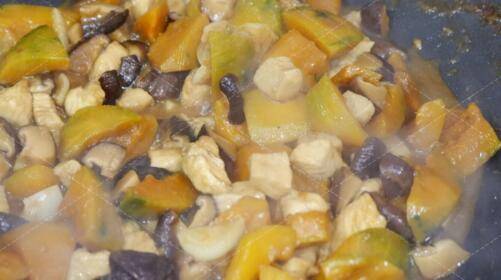 干香菇20克、贝贝南瓜、鸡胸肉、蒜、酱油、盐、料酒、胡椒粉、淀粉、酱油。