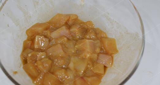 香菇提前泡发好,鸡胸肉切成小块,加入料酒、胡椒粉、酱油、淀粉抓匀静置15分钟。