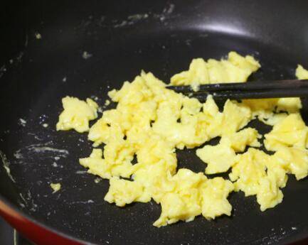 5、平底锅中加入适量油,将蛋液倒入锅中,用筷子迅速搅散成小粒,待鸡蛋慢慢凝固时盛出备用。