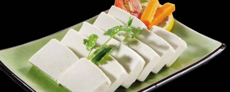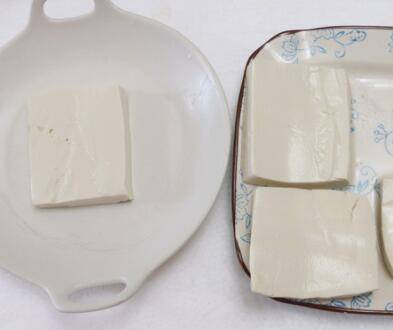 8、豆腐切成厚薄均匀的四大片。