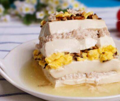 用料:嫩豆腐350克、猪肉100克、鸡蛋2个、香菇3朵、姜末2克、盐适量、鸡精1/2小匙、植物油少许、水淀粉1汤匙。