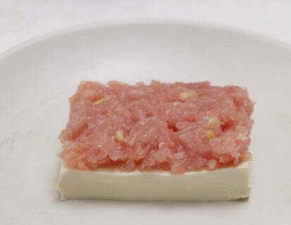 9、最底层放一片豆腐,铺上一层肉馅。