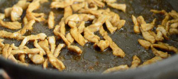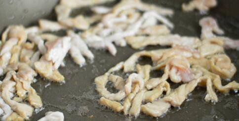 4、锅里烧热油,放入肉丝快速炒散。