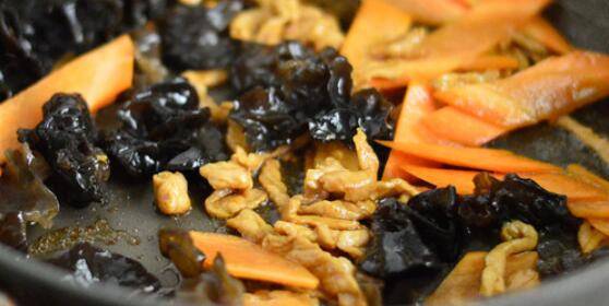 6、加入胡萝卜和木耳一起拌炒,炒至断生。