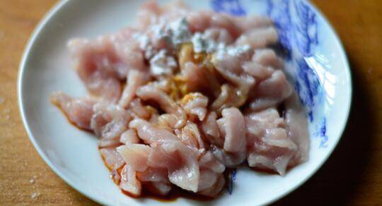 2、猪肉切成丝,放入盘中,用少许淀粉和酱油腌制一会儿。