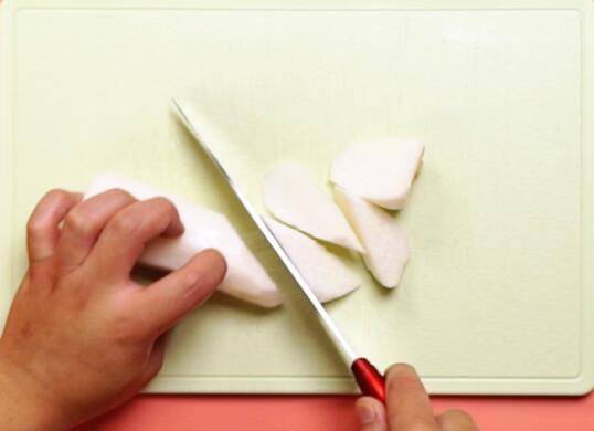 5、切成菱形片的山药继续泡在水里,不用放醋,或者柠檬,山药只要不接触空气就不会氧化变色。