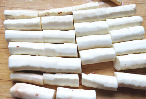 2、山药去皮洗净切成小段,放在烧开水的蒸屉上大火蒸十几分钟至熟。