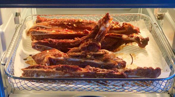 5、烤至6分钟的时候取出烤网,将猪扇子骨翻一个面,放回烤箱继续烤6分钟。