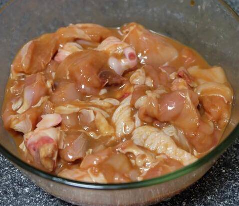 2、鸡腿肉切小块洗净,加入蒜粒、姜、生抽、盐、十三香、生粉均匀搅拌,腌制15分钟。