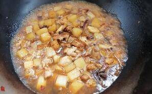 4、锅热将葱、姜、蒜、八角、花椒炒香,下鸡肉、土豆炒干水气。