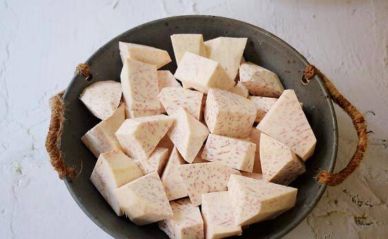 5、芋头去皮洗净滚刀切块,铺上盘底备用。